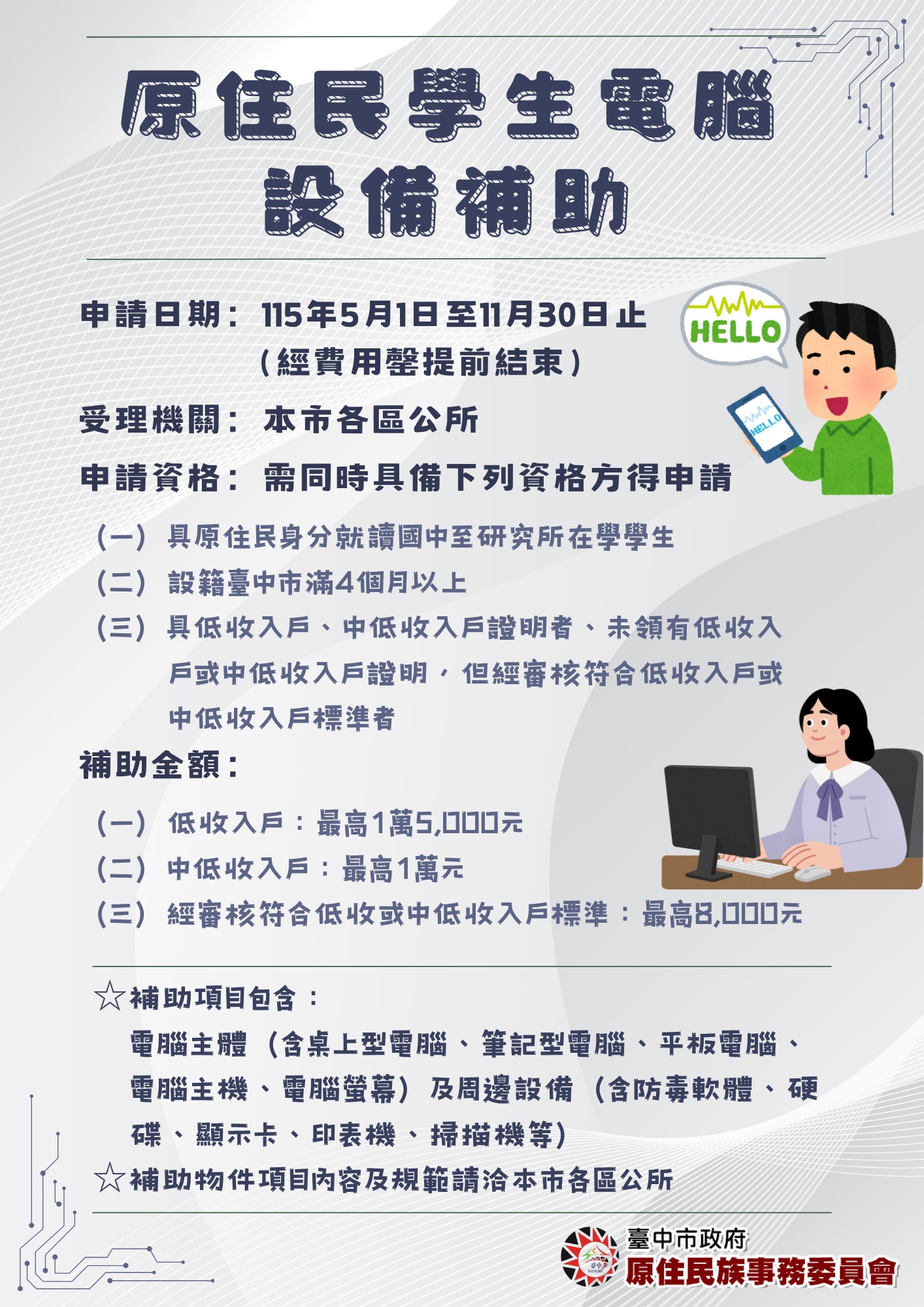 (五) 旨揭補助要點及申辦所需書件,請至臺中市政府原住民族事務委員會網站首頁/便民服務/各項福利措施/115年度原住民學生電腦設備補助申請查詢及下載(https://www.ipd.taichung.gov.tw/12710/Lpsimplelist)。