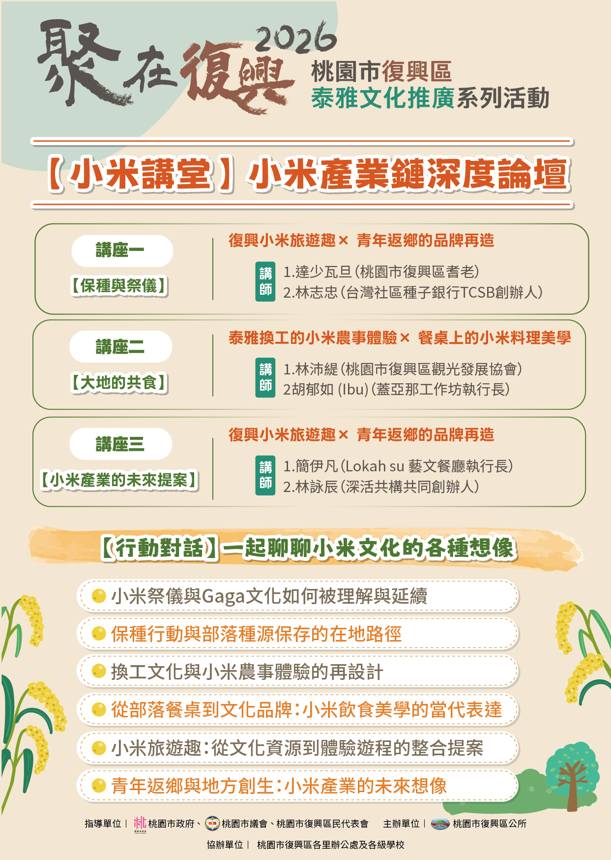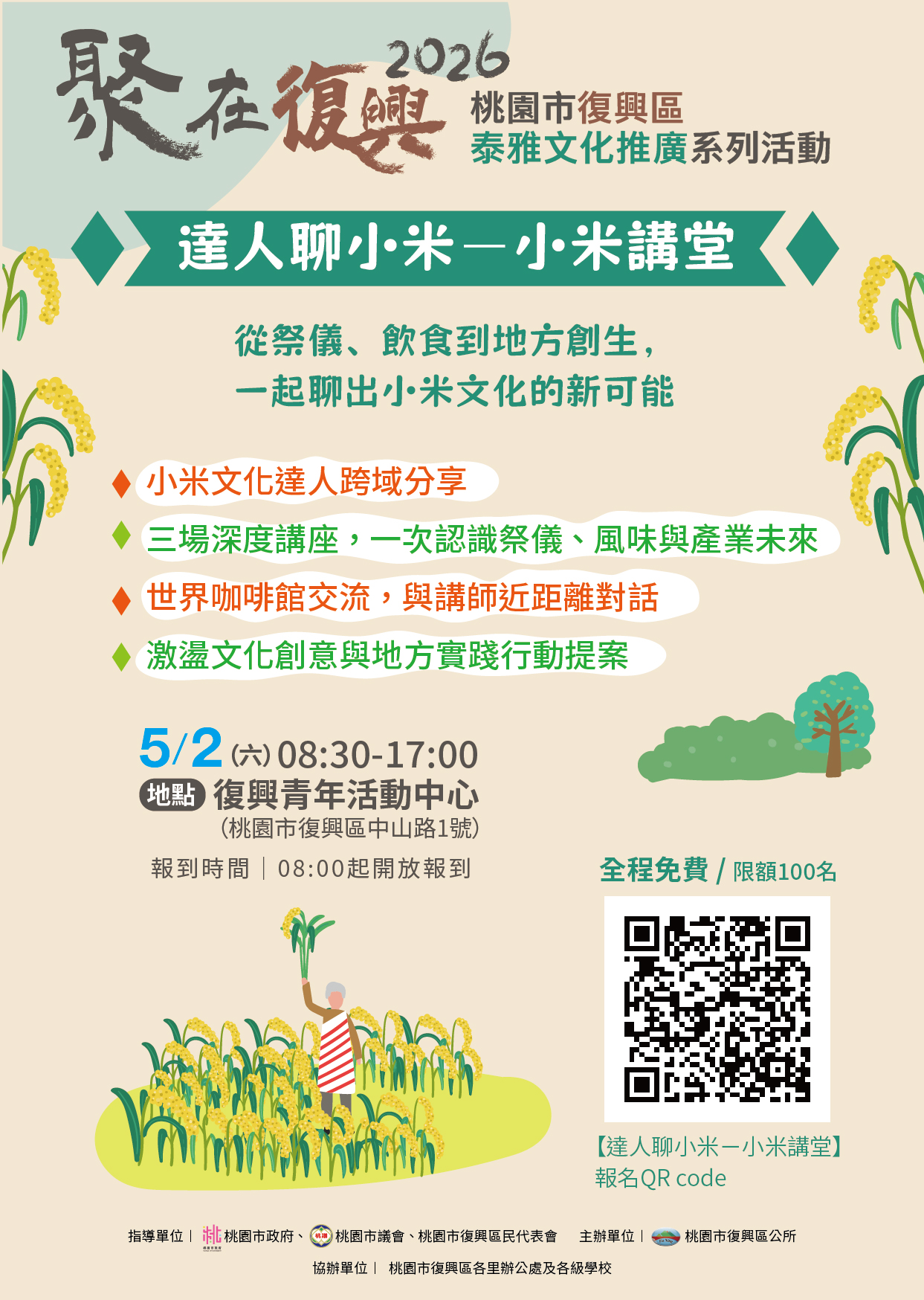 一、為推廣泰雅文化,深化小米祭儀、飲食文化及地方創生等議題,桃園市復興區公所訂於115年5月2日(星期六)8時30分至17時,假復興青年活動中心大禮堂(桃園市復興區中山路1號)辦理旨揭活動。活動規劃三場深度講座,並結合「世界咖啡館」交流形式,邀集部落耆老、產業職人及跨域講師共同分享,期透過多元對話,探討小米文化保存、產業發展及青年返鄉等面向,拓展在地文化推廣之深度與廣度。